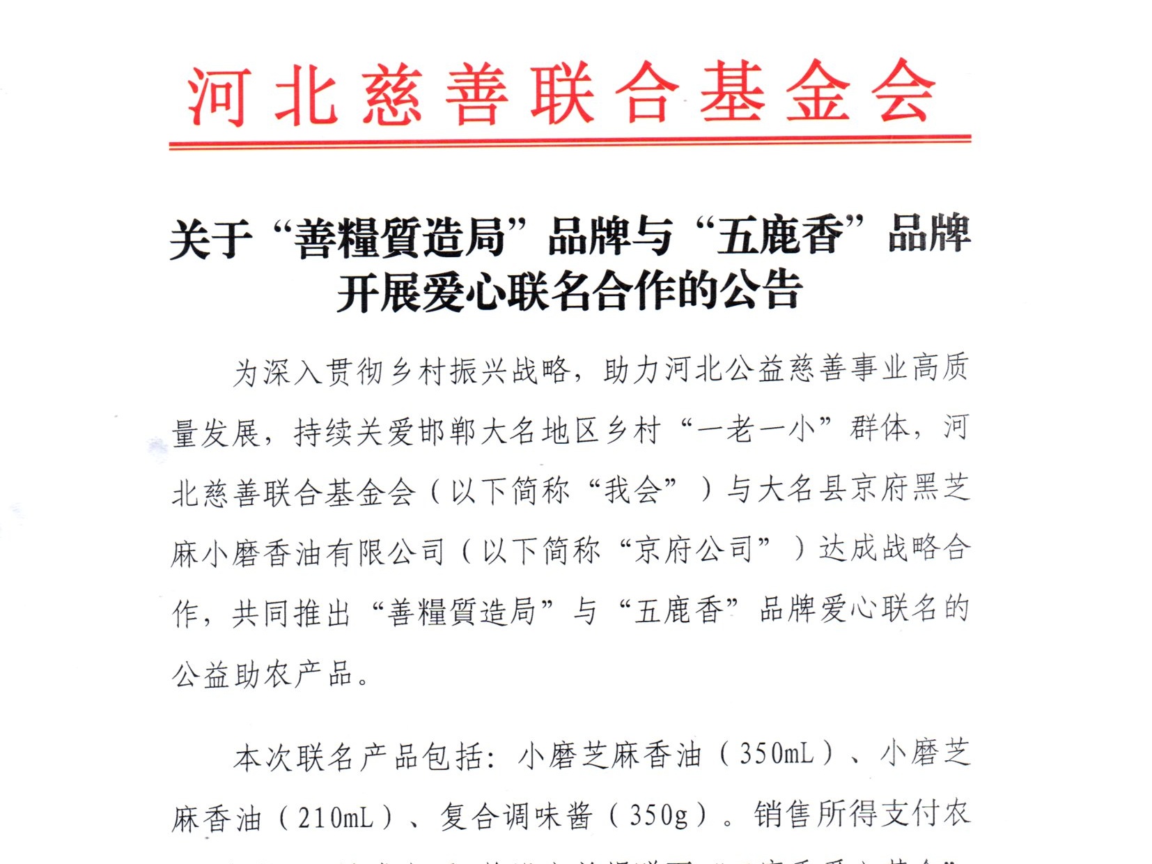 关于“善糧質造局”品牌与“五鹿香”品牌开展爱心联名合作的公告