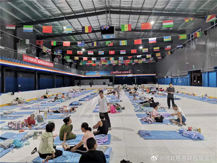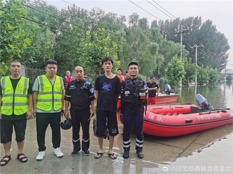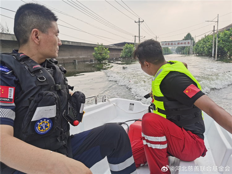 8日17时30分,河北慈联应急救援队携带1艘玻璃钢船和1艘橡皮艇到达高碑店东马营天润家园二期进行救援;
