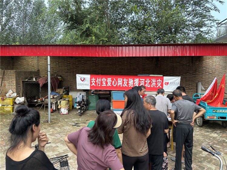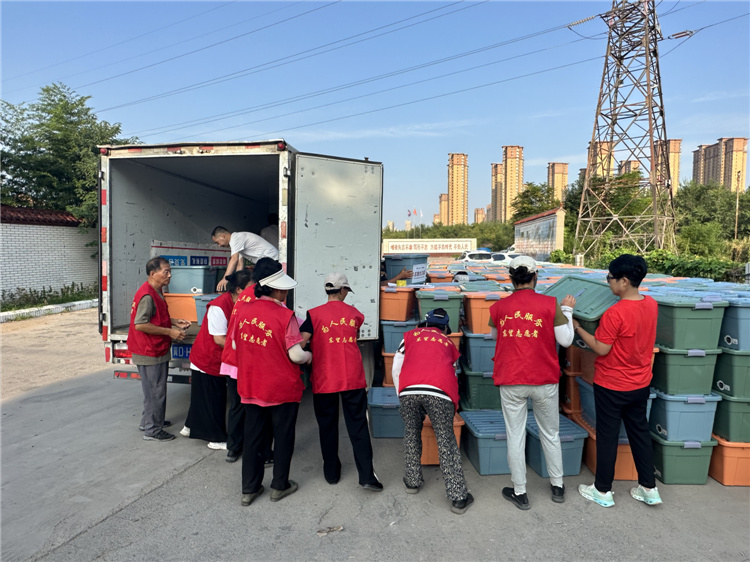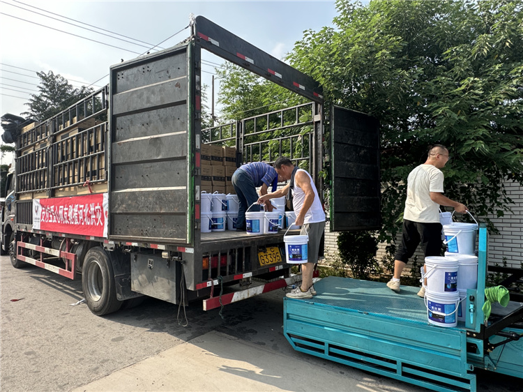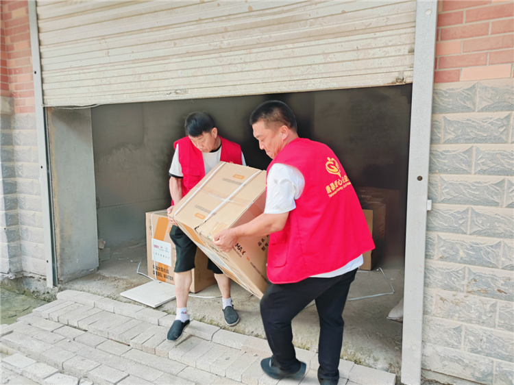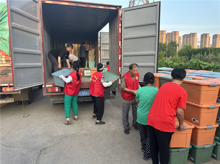 14时,志愿者为安新县大北头村村民发放应急生活箱200个。