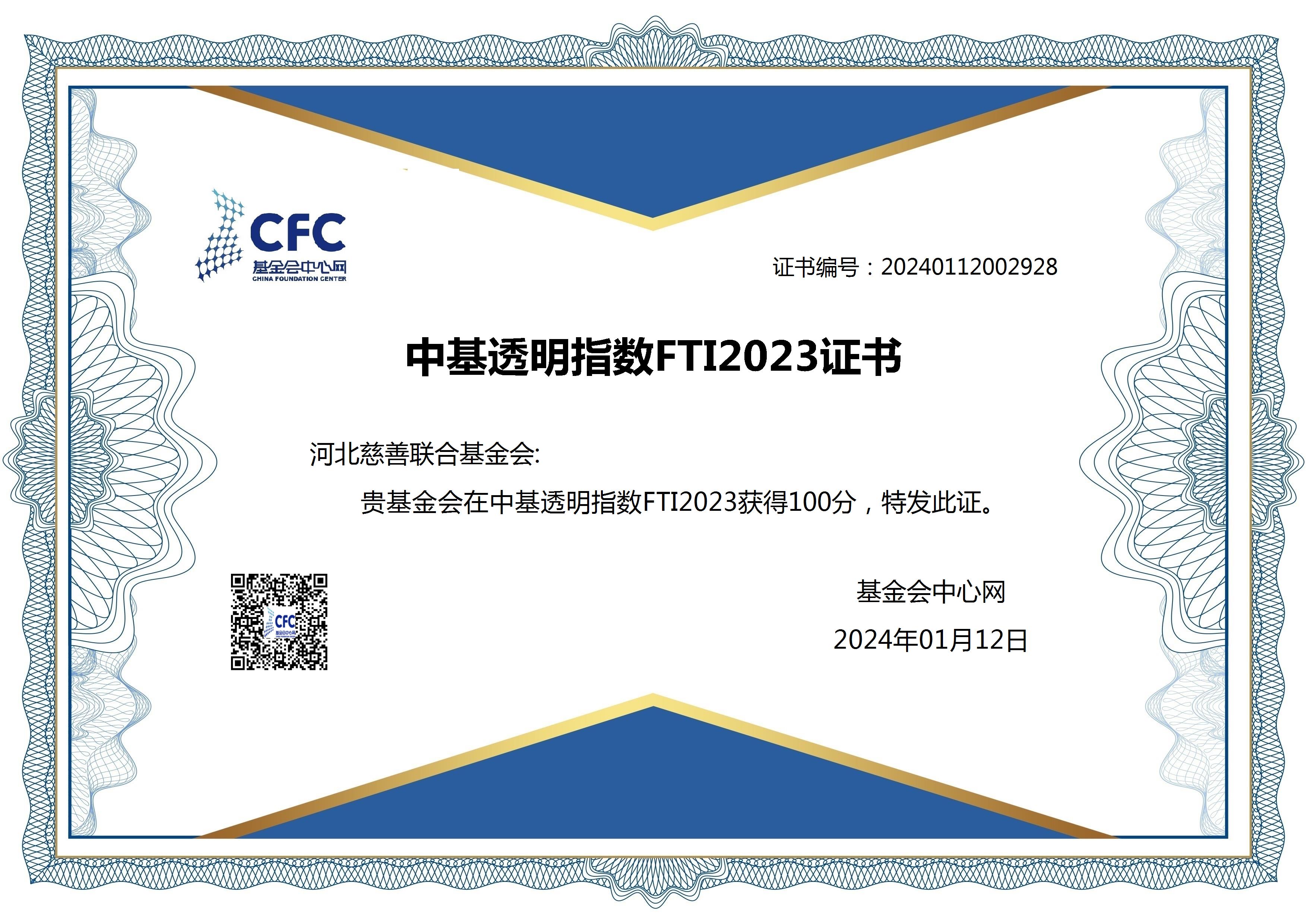 河北慈善联合基金会获2023年中基透明指数FTI100分