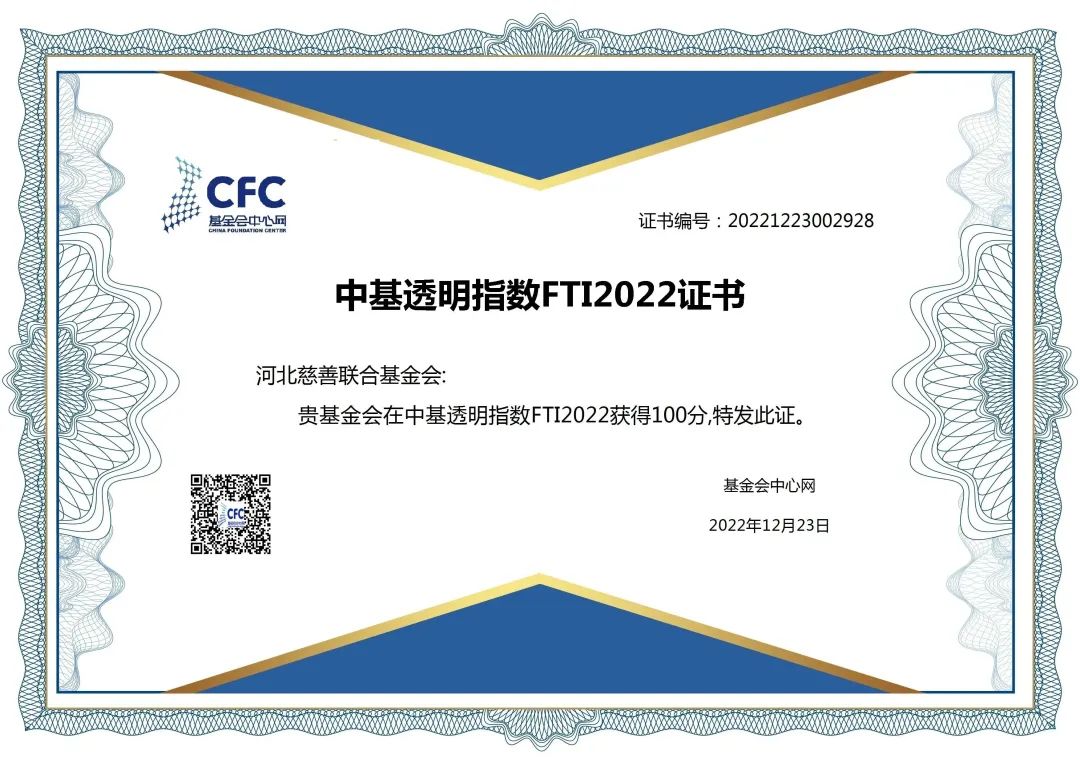 100分!河北慈善联合基金会获2022年中基透明指数FTI满分