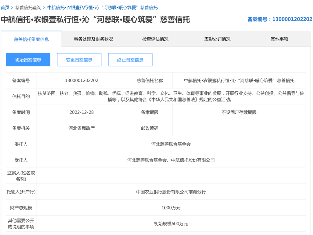 近日,《中航信托· 农银壹私行恒· 沁“河慈联· 暖心筑爱 ”慈善信托》在省民政厅完成备案,为河北首单省级现金慈善信托。